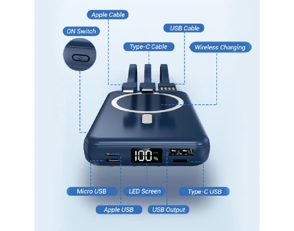 Includes Micro USB,Apple USB,USB Output,Type-C USB,LED Screen