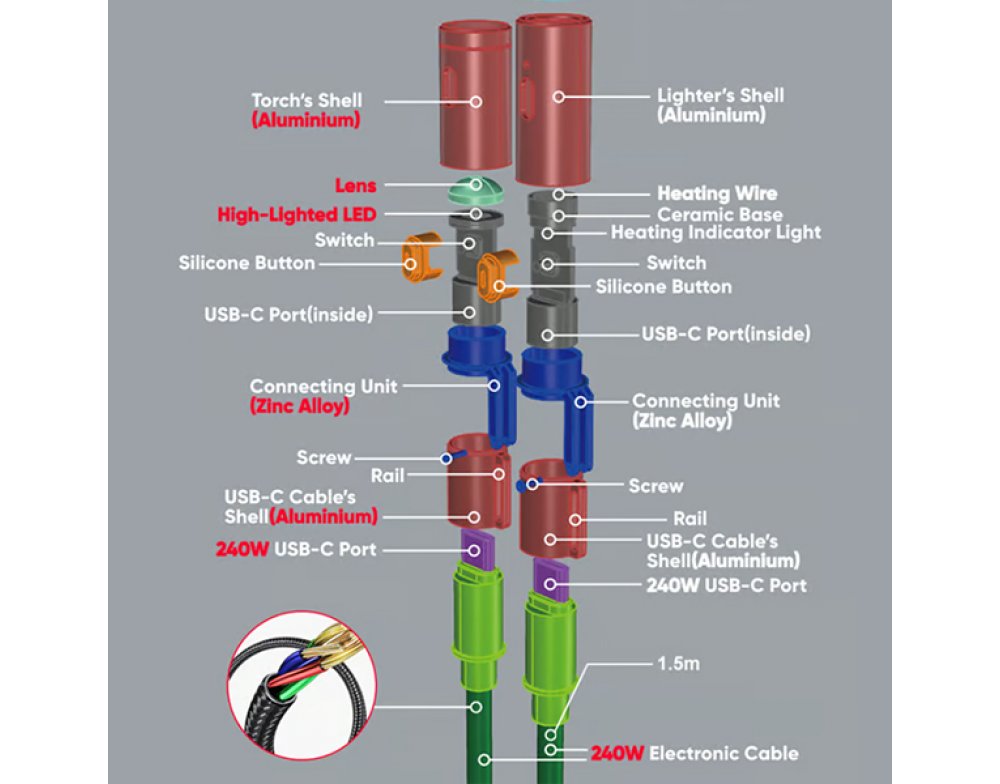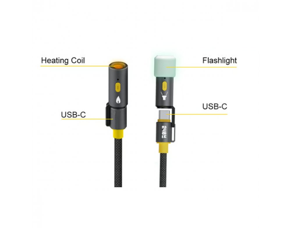 All-in-one power solution with Electric charging, a Light feature for illumination, and a Fire source for your in-car electronic accessories. Environmentally Friendly and Battery-Free! Unlike flashlights or lighters that rely on internal batteries, this cable simply needs to be connected to your phone or power bank, eliminating the need for batteries altogether. Say goodbye to disposable batteries and hello to sustainability with our battery-free solution.