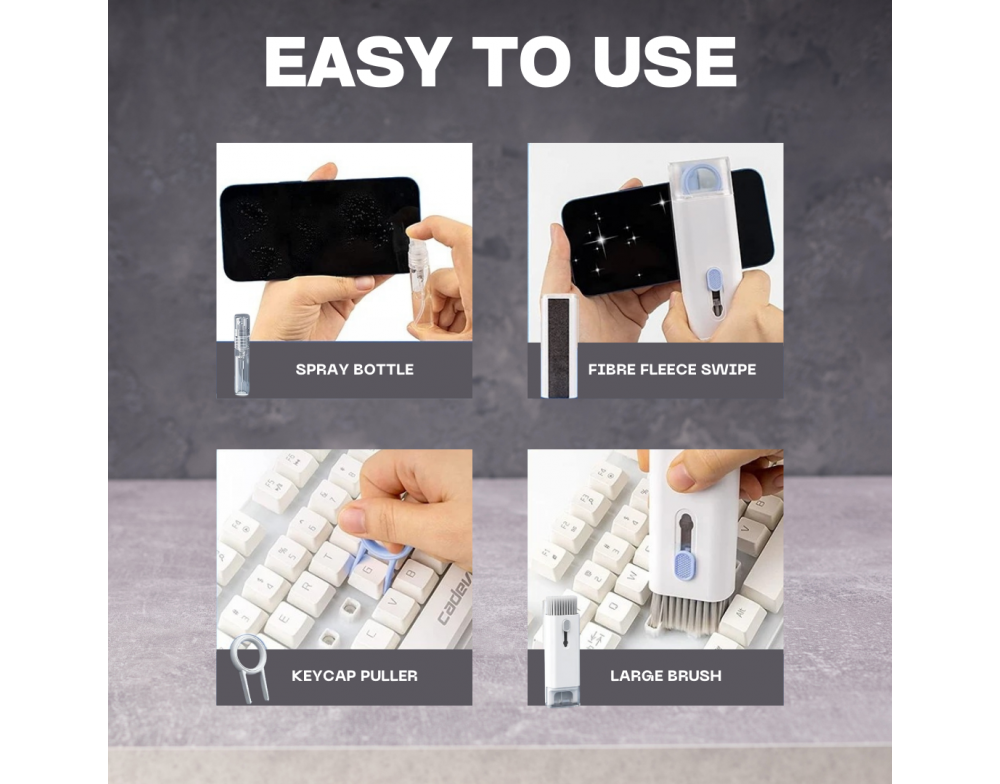 - All-in-One Cleaning Kit: Includes a large brush, mini brush, earphone cleaning pen, silicone tip, key puller, flocking sponge, fibre fleece swipe, and a 5ml spray bottle, ensuring you have the right tool for every cleaning task.