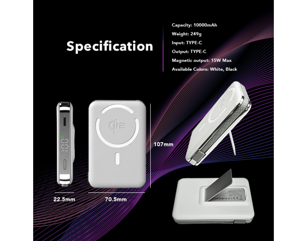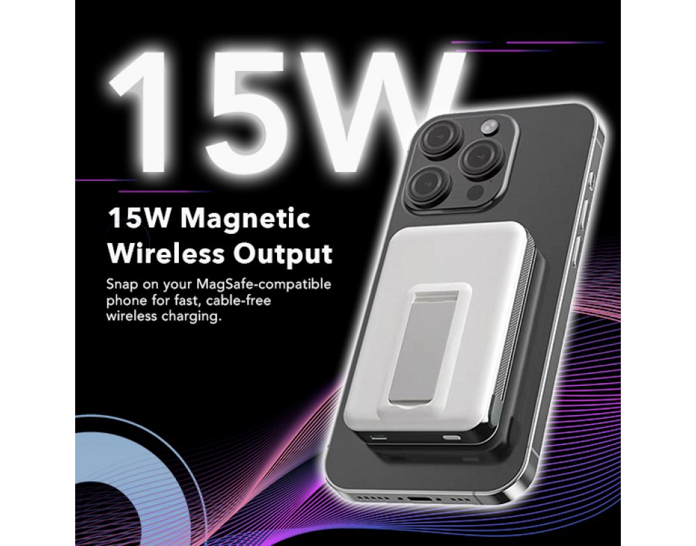 Enjoy the ultimate convenience with a built-in cable and magnetic charging stand, 15W magnetic wireless output for instant snap-and-charge—all packed in a compact, stylish design with universal Type-C input and output for seamless compatibility.