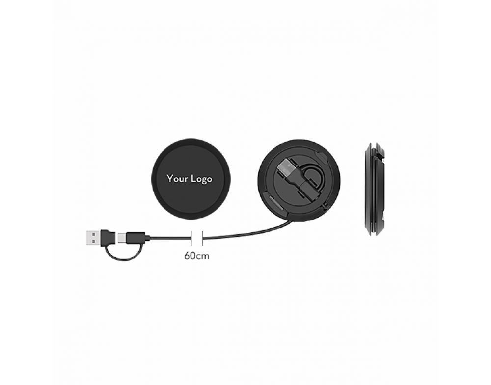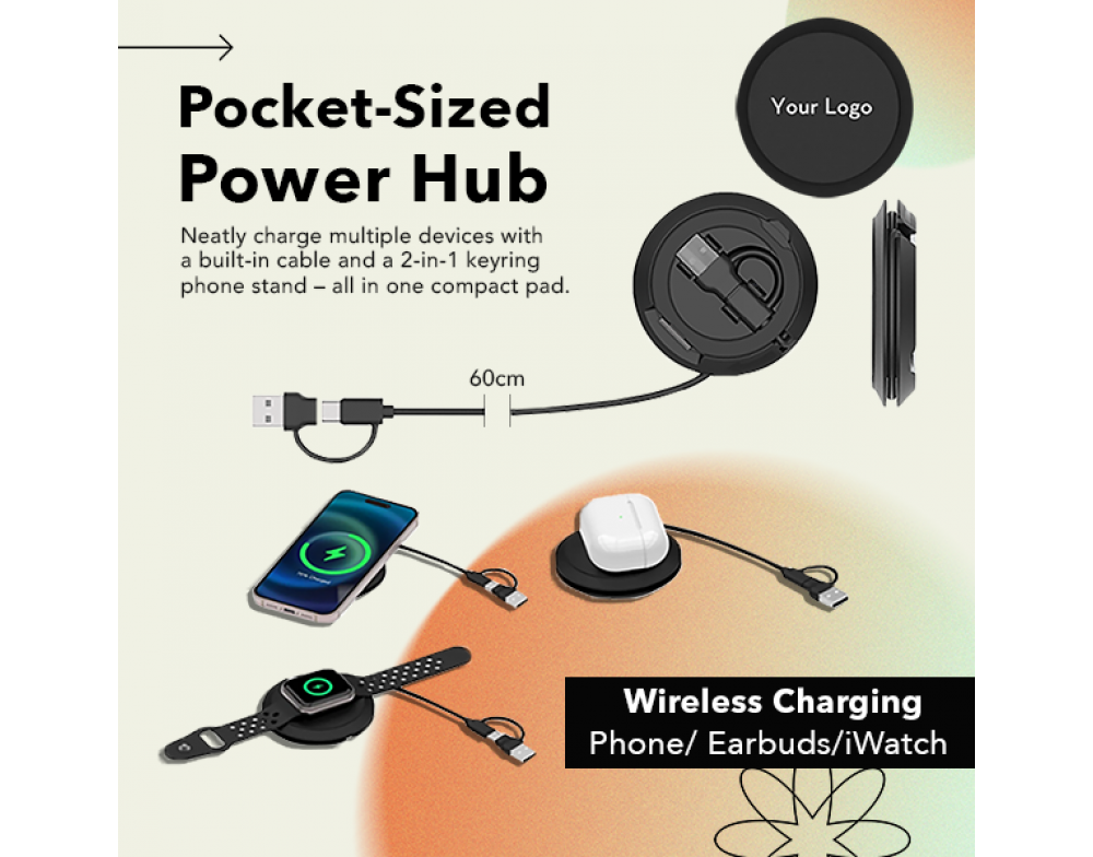 Charge your phone, iWatch, and earbuds effortlessly with this compact 3-in-1 magnetic wireless charger – complete with a built-in cable, keyring, and phone stand for everyday convenience.