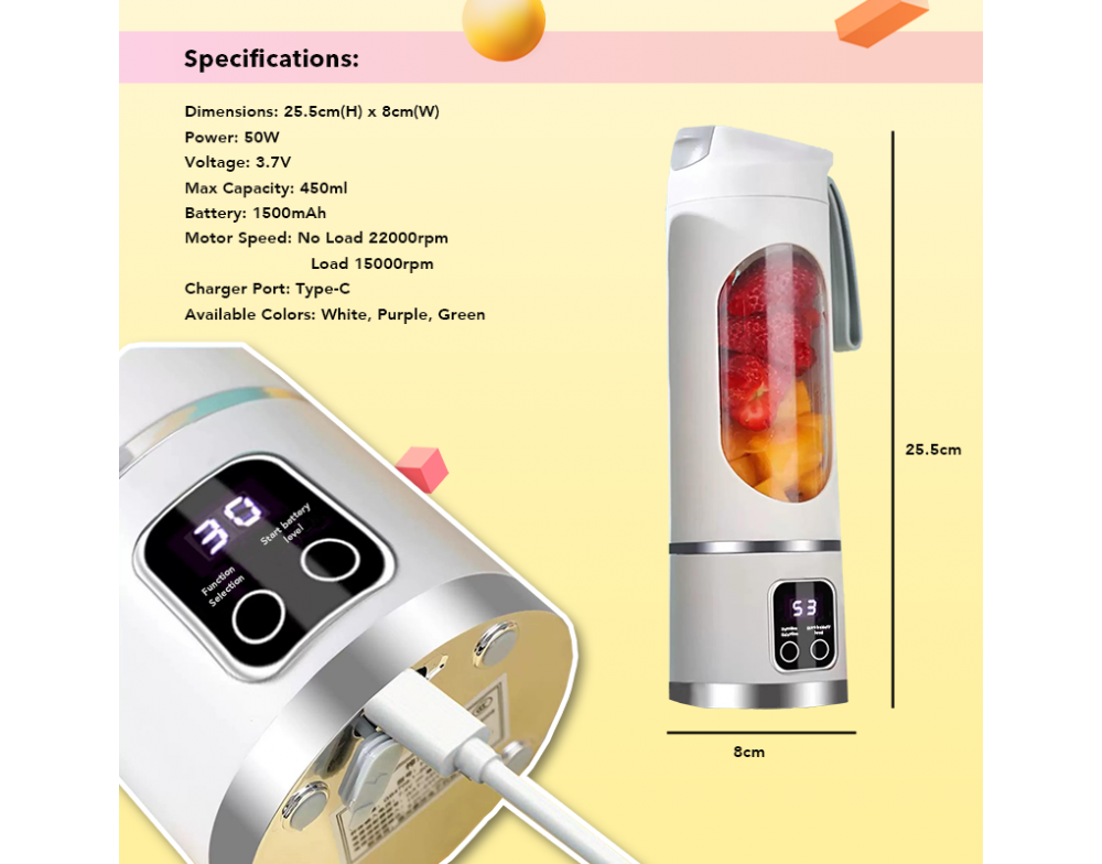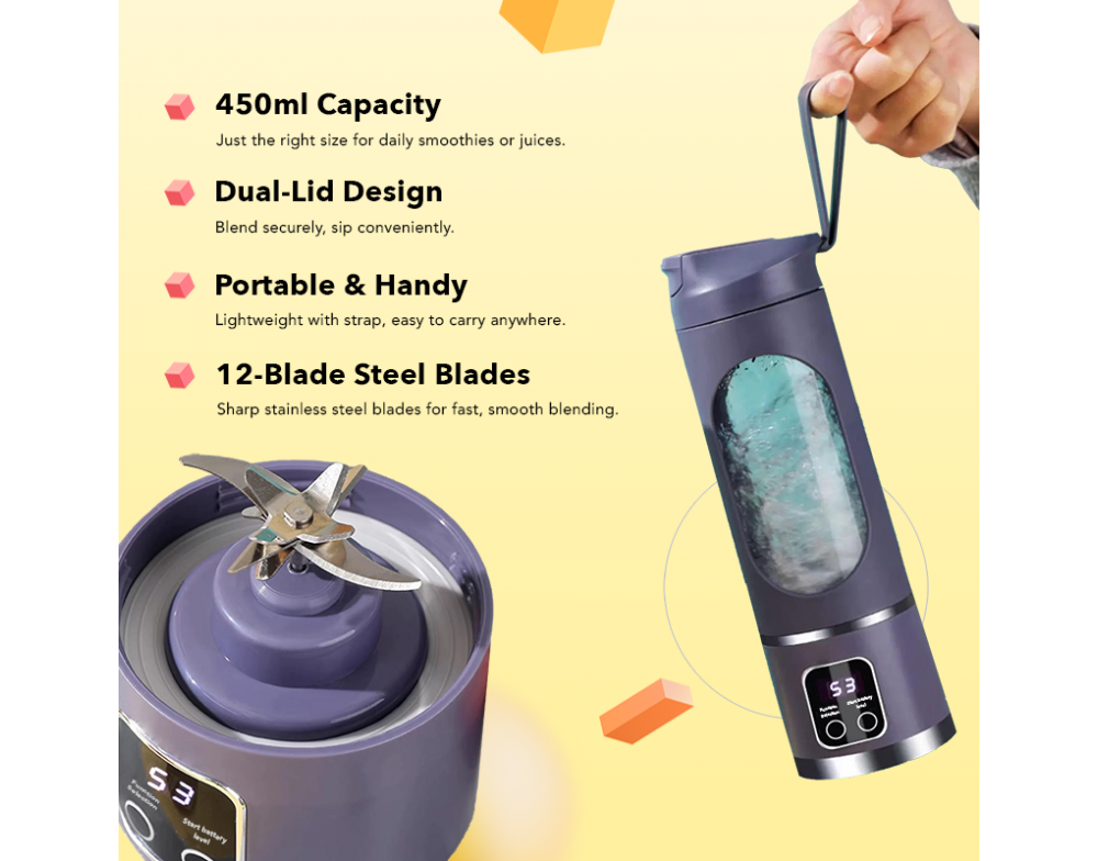 This 450ml portable blender is your perfect daily companion—featuring a powerful 22,000rpm motor, and a 1500mAh rechargeable battery. With a digital display and convenient Type-C charging, you can blend smoothies, juices, or shakes anytime, anywhere—no cords needed!
