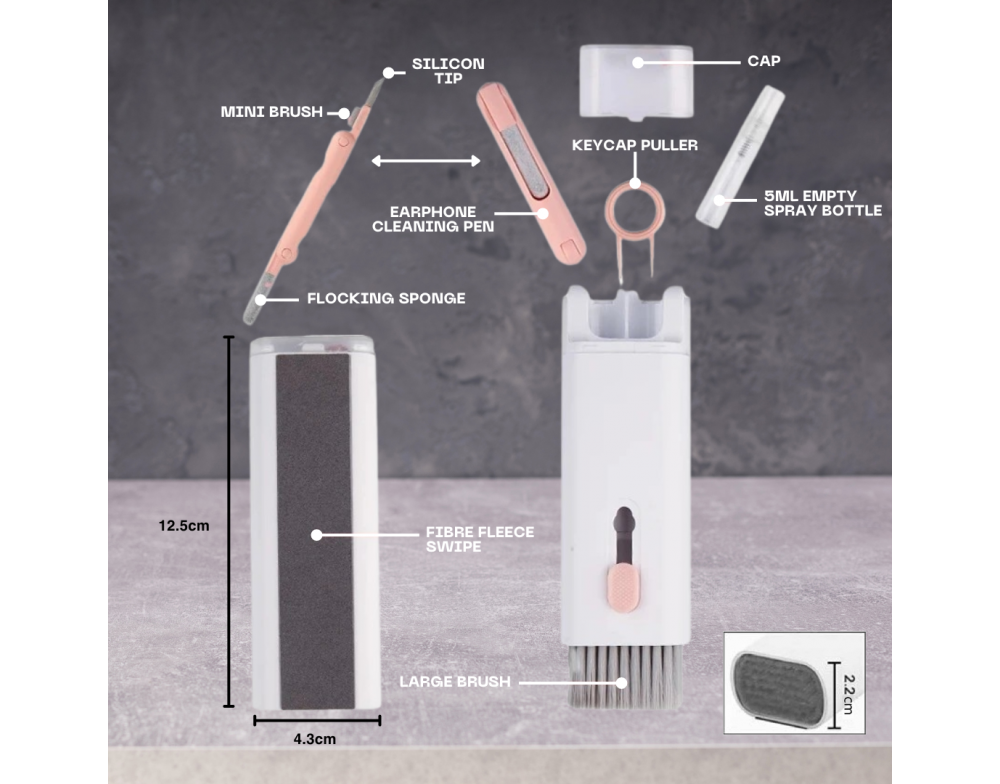 - All-in-One Cleaning Kit: Includes a large brush, mini brush, earphone cleaning pen, silicone tip, key puller, flocking sponge, fibre fleece swipe, and a 5ml spray bottle, ensuring you have the right tool for every cleaning task.