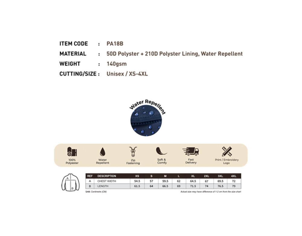 A stylish and comfortable mock neck zip up jacket with unisex cutting. It is made of good quality 100% Polyster. Water repellent fabric which is suitable for both indoor & outdoor use.