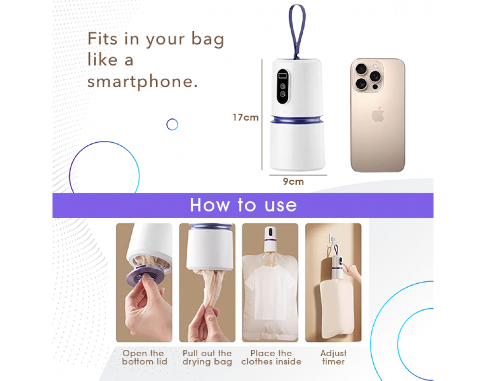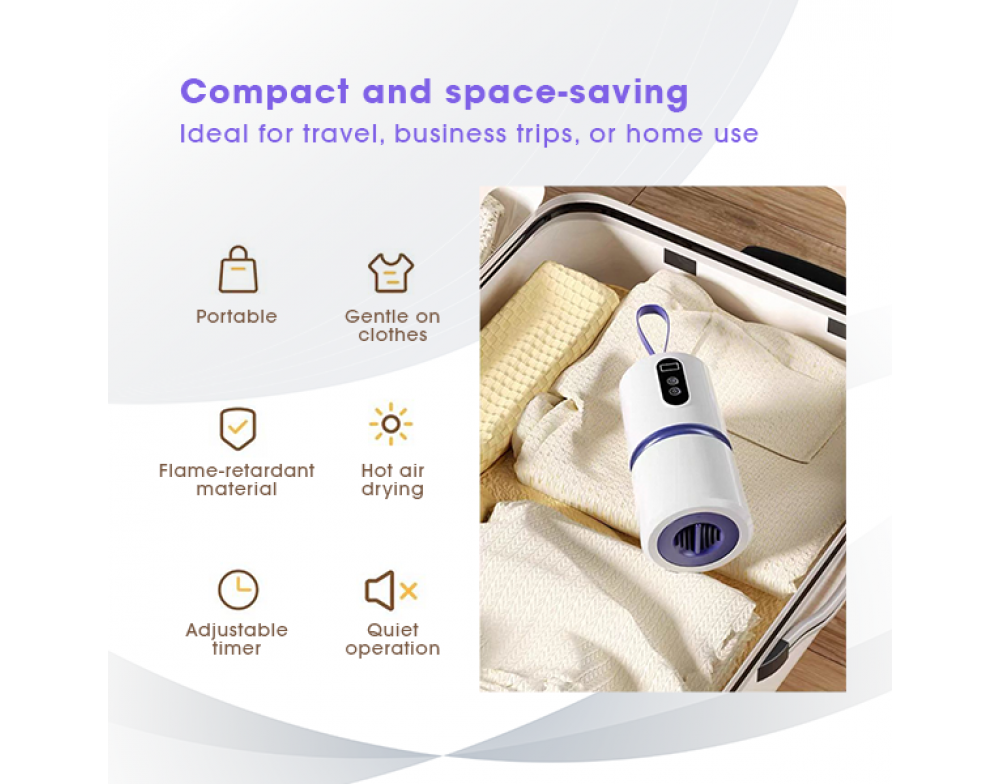 Pocket-sized portable clothes dryer with 360° hot air drying. Low noise, space-saving, and ready anytime you need dry, fresh clothes.