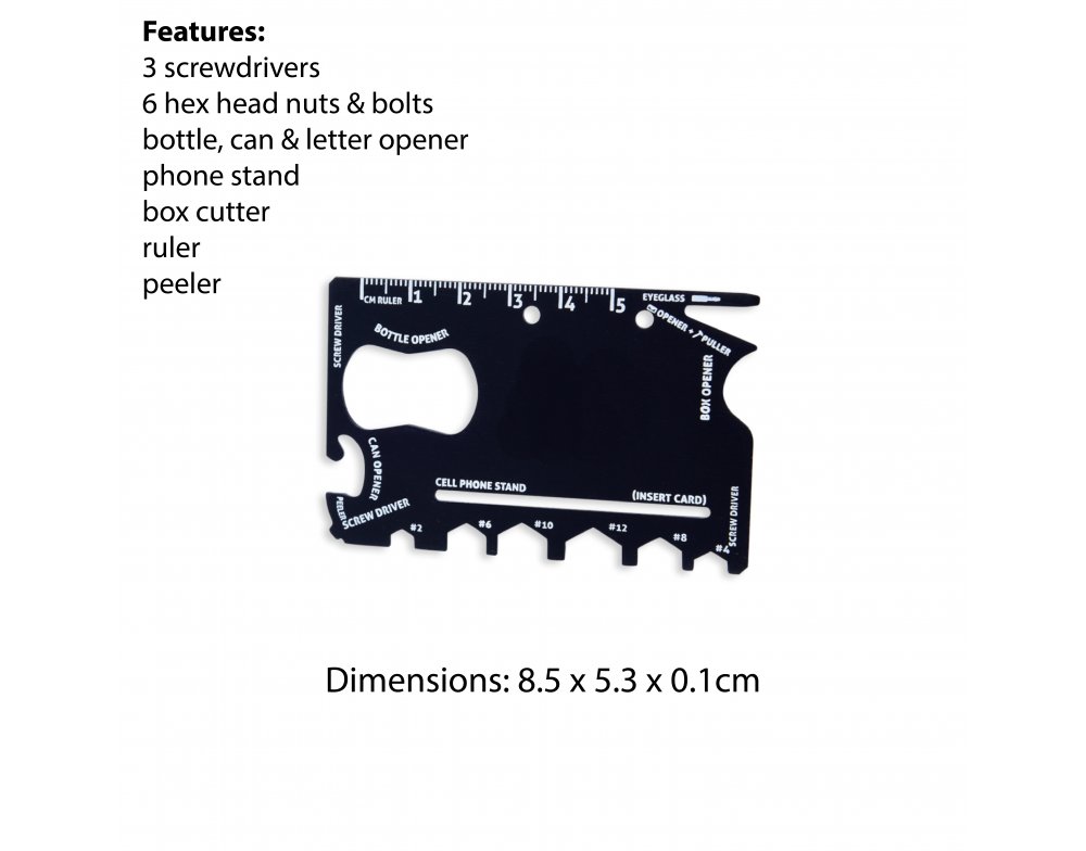 Features: 3 screwdrivers; 6 hex head nuts & bolts; bottle, can & letter opener; phone stand; box cutter; ruler; peeler.