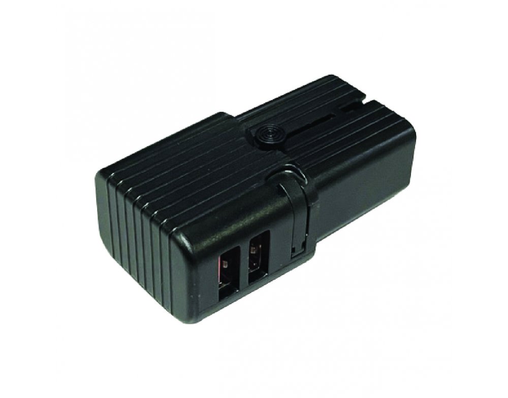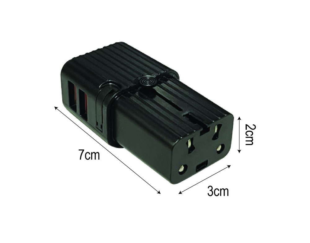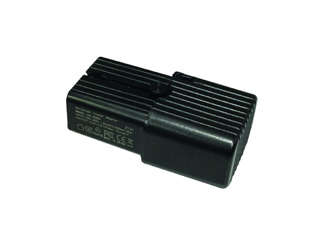 All in one small universal adapter with 2 USB interfaces which allow you to charge 2 devices at the same time.